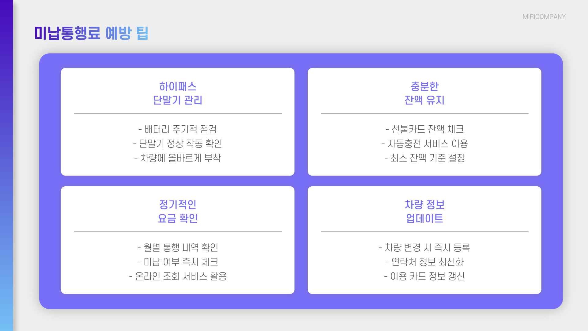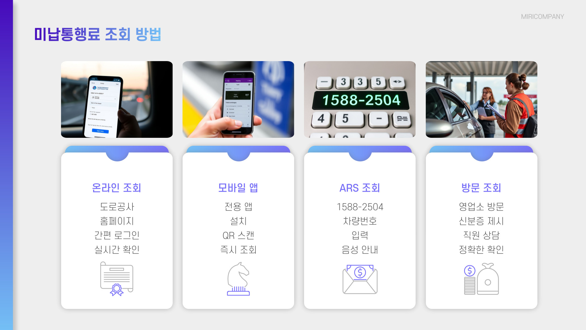 고속도로를 이용하다 보면 미납통행료가 발생할 수 있습니다. 이러한 미납통행료는 시간이 지날수록 금액이 증가하고, 나중에는 큰 부담이 될 수 있습니다. 따라서 미납통행료를 빨리 해결하는 것이 중요합니다. 이 글에서는 고속도로 미납통행료를 납부하는 다양한 방법과 꿀팁을 소개합니다.