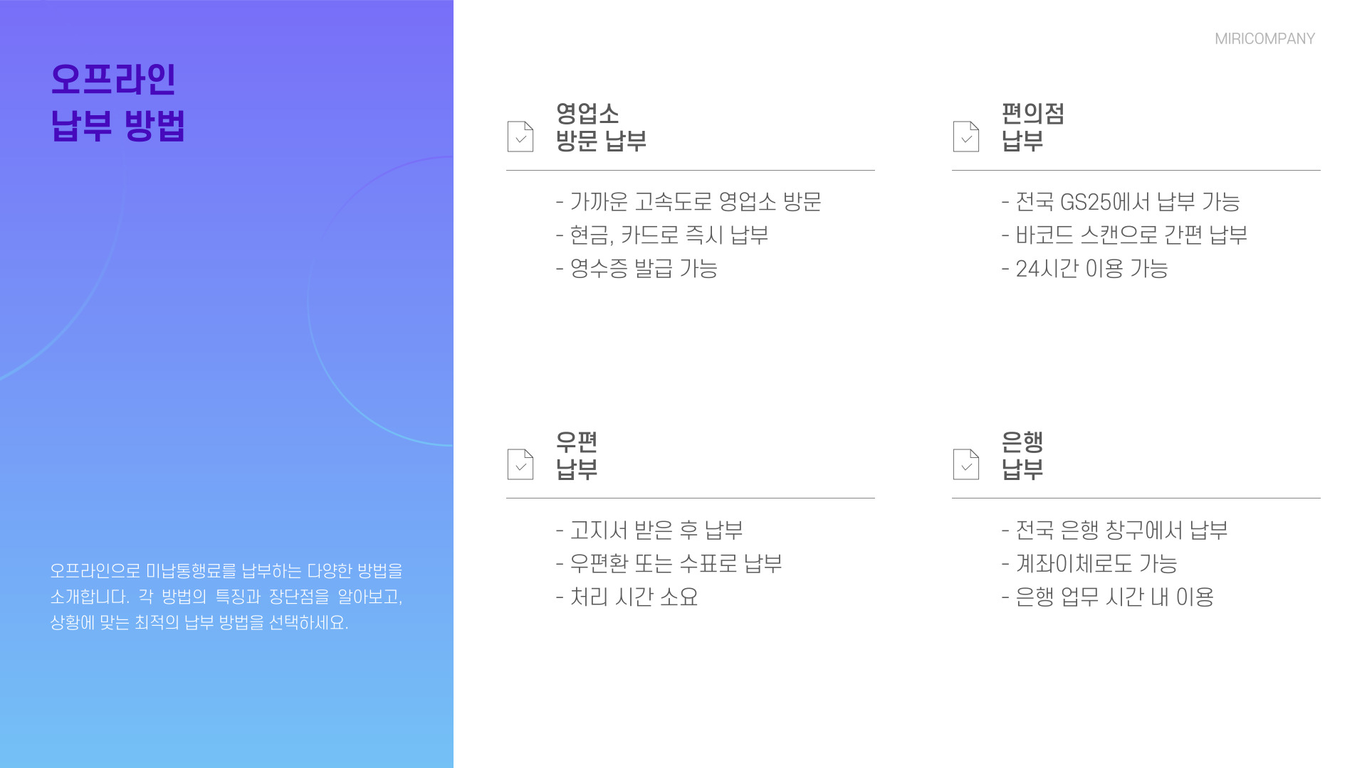 미납통행료를 납부하는 방법은 다양합니다. 가장 일반적인 방법은 온라인 뱅킹을 이용하는 것입니다. 한국도로공사 사이트나 모바일 앱에서 직접 납부할 수 있습니다. 또한, ATM 기기에서도 납부가 가능하여, 현금으로도 처리할 수 있는 방법이 있습니다. 미납통행료를 납부할 때는 납부 확인증을 반드시 보관해야 합니다.