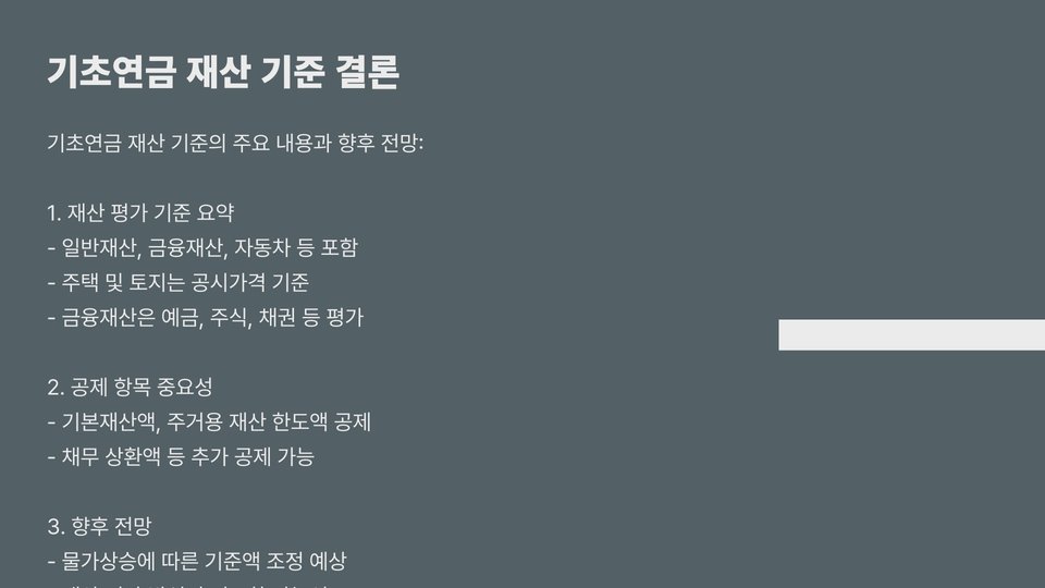 이처럼 기초연금 수급자격의 재산 기준은 노인의 경제적 지원을 결정하는 중요한 요소입니다. 제시된 정보들을 바탕으로 자신의 상태를 점검하고, 필요한 경우 전문가와 상담하여 정확한 정보를 얻는 것이 좋습니다. 기초연금은 궁극적으로 노인들의 삶의 질을 높이는 중요한 정책이므로, 이에 대한 관심과 이해는 필수적입니다.