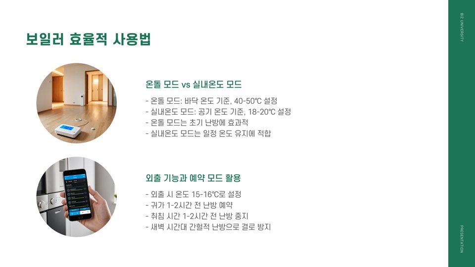 더 나아가, 절전형 보일러를 사용하는 것도 고려해볼 만합니다. 이런 보일러는 에너지 효율성이 높아 난방비를 줄여줄 수 있습니다. 보일러를 관리하여 주기적으로 청소하고 정비도 병행하면 사용 효율성을 높일 수 있습니다.