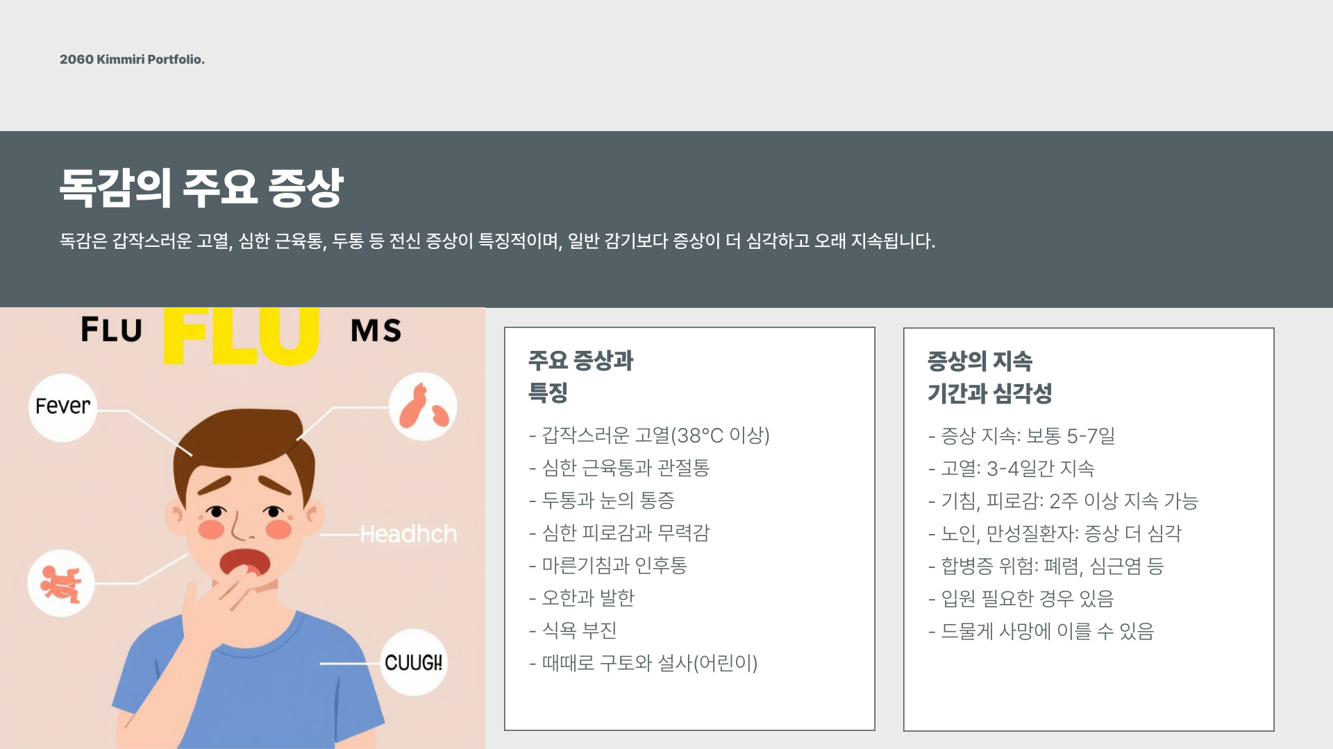 - 독감 증상이 있을 경우 즉시 검사를 받는 것이 좋습니다.