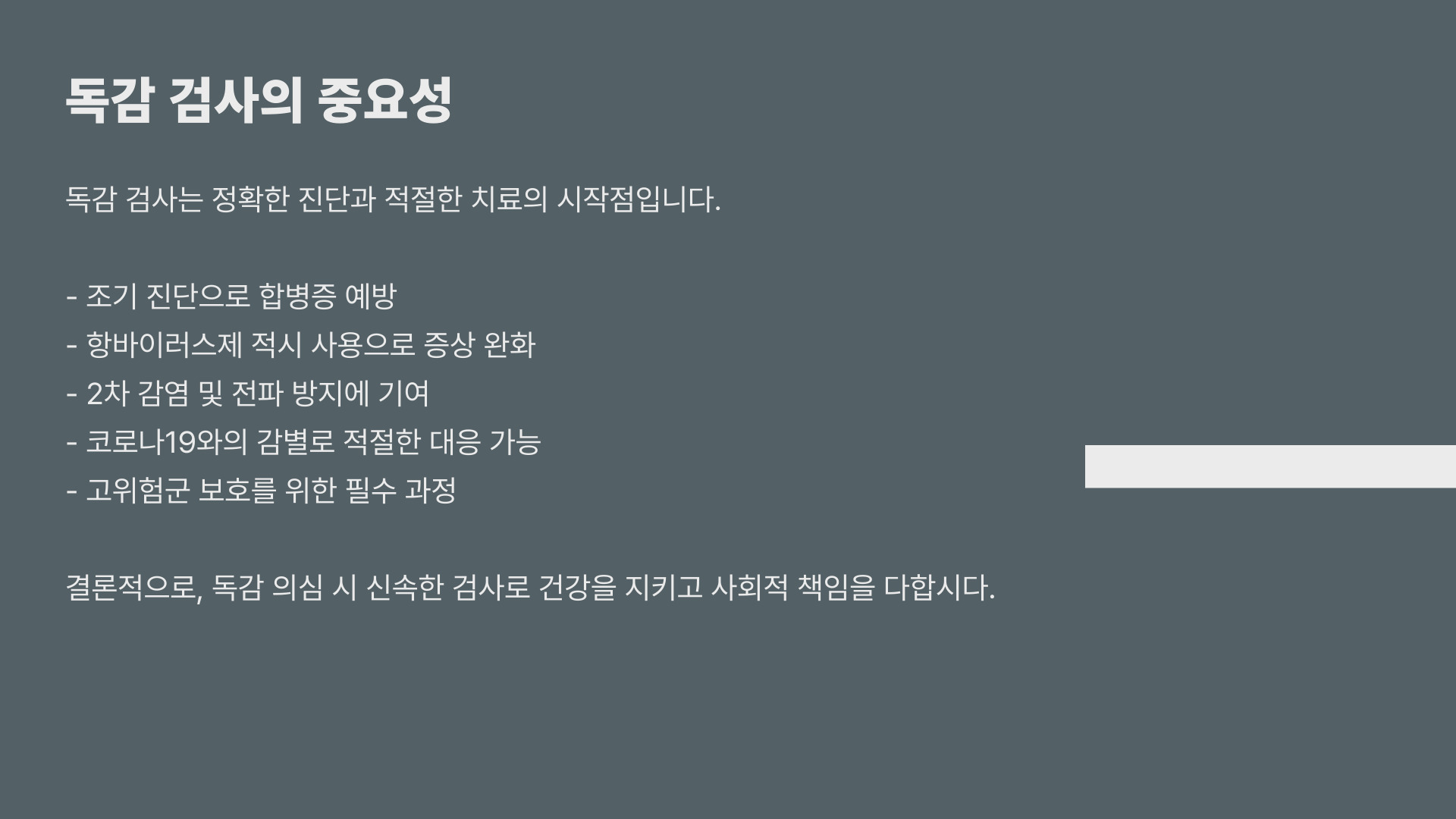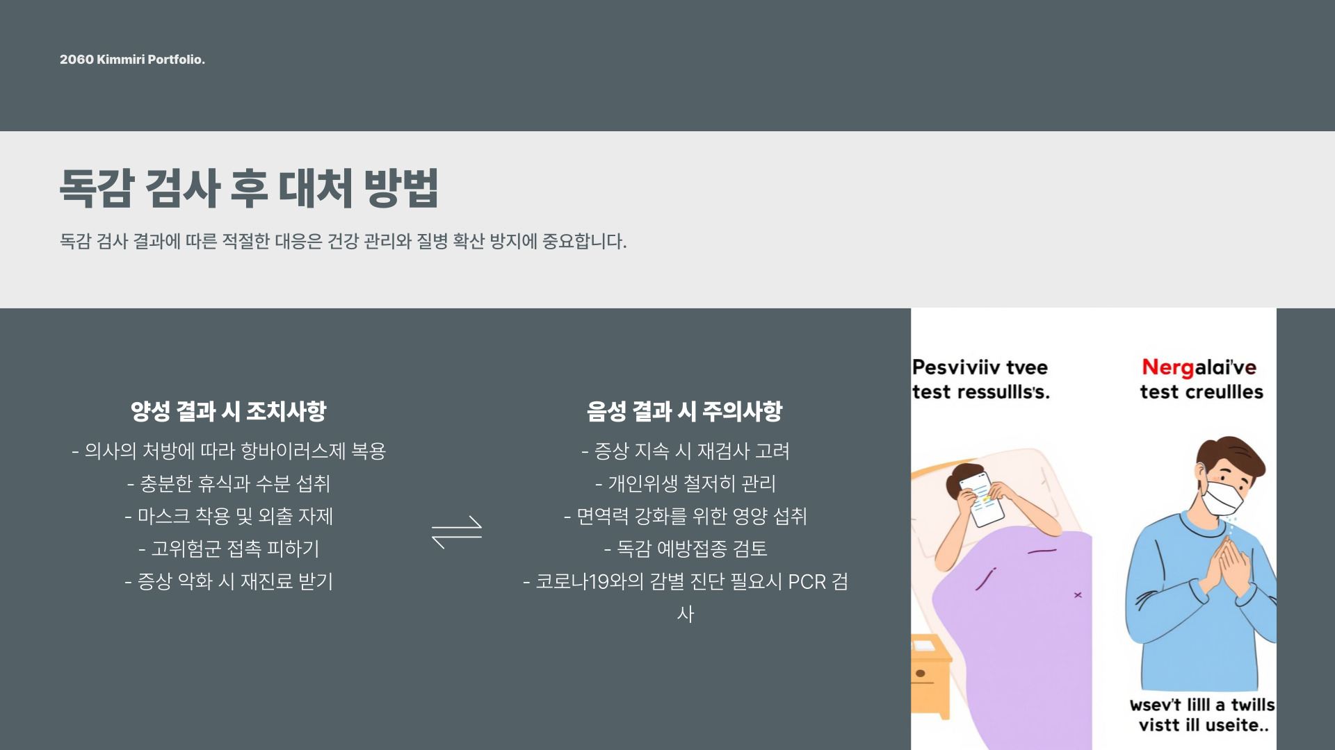 독감 검사는 단순히 감염 여부를 확인하는 것뿐만 아니라, 조기 치료와 합병증 예방, 면역력 증가에도 큰 역할을 합니다. 독감 증상이 나타난다면 꼭 검사를 받고, 의사의 조언을 따라 적절한 조치를 취하는 것이 중요합니다. 건강을 지키기 위한 첫걸음으로, 독감 검사를 반드시 고려해야 합니다.