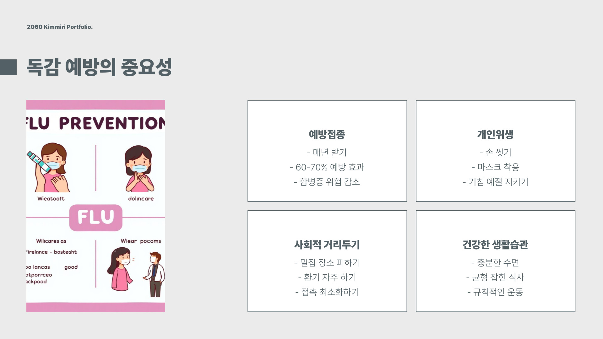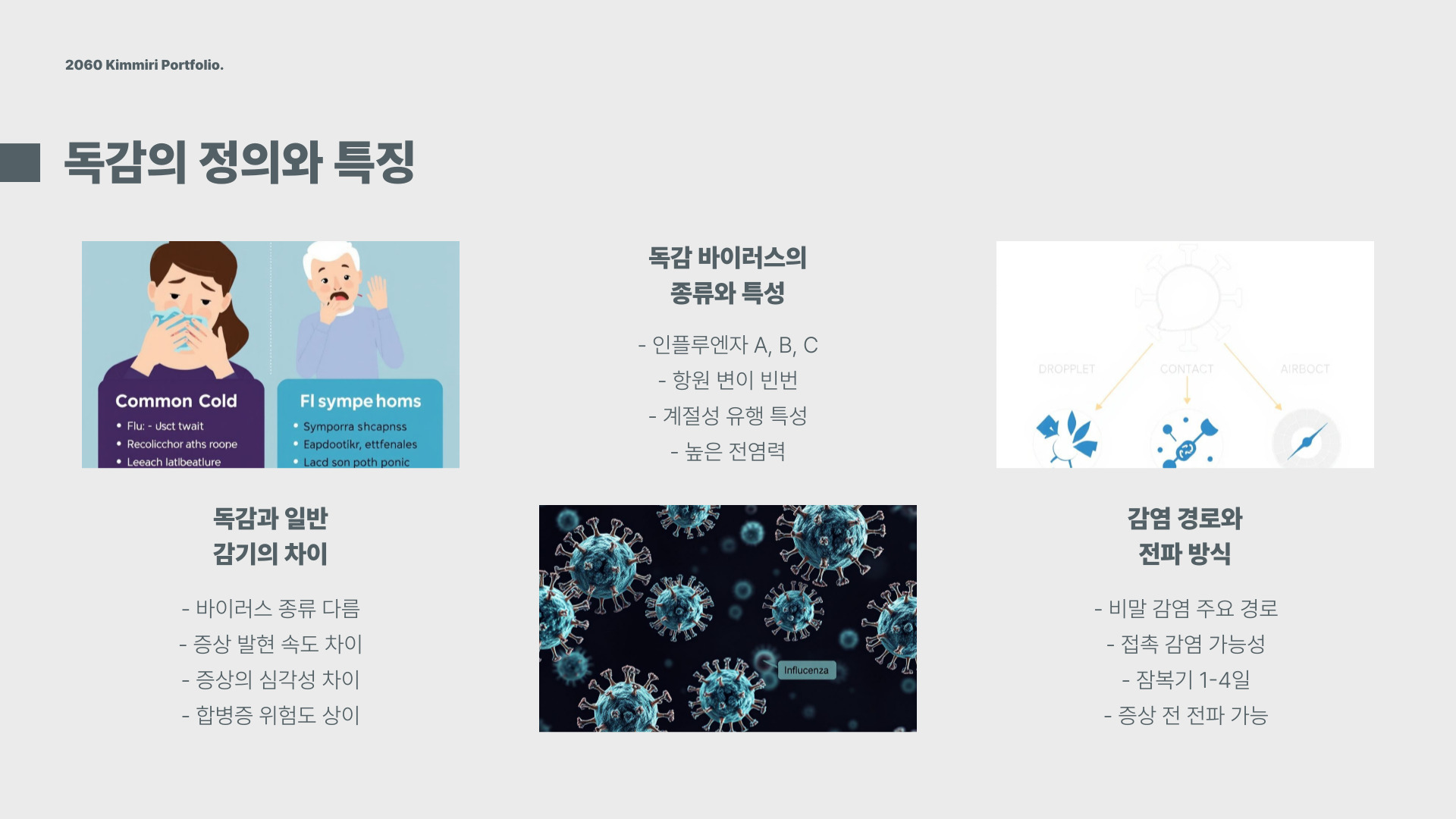 독감은 인플루엔자 바이러스에 의해 발생하는 호흡기 질환으로, 감기와는 다른 심각한 증상을 동반합니다. 고열, 기침, 인후통, 근육통 등의 증상이 나타나며, 이는 일상 생활에 큰 영향을 미칠 수 있습니다. 매년 겨울철에 유행하는 독감은 특히 노인이나 어린이, 면역력이 약한 사람들에게 치명적일 수 있습니다.