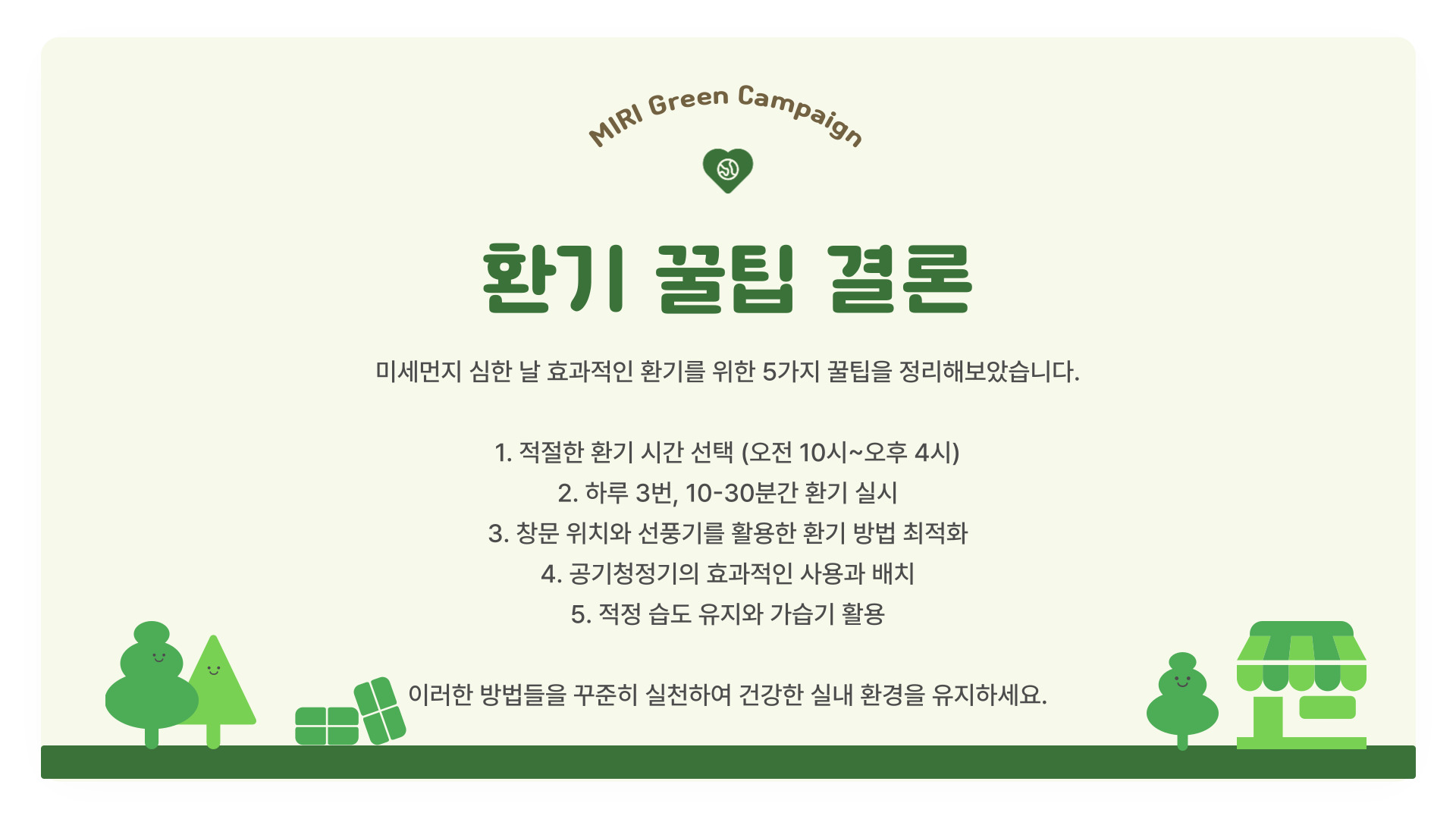 위의 다섯 가지 팁을 통해 미세먼지가 심한 날에도 안전하고 건강하게 환기할 수 있습니다. 자연환기의 중요성과 공기청정기, 실내 식물 이용 등 다양한 방법을 조화롭게 활용하여, 건강을 지키는데 최선을 다해 주시기 바랍니다.