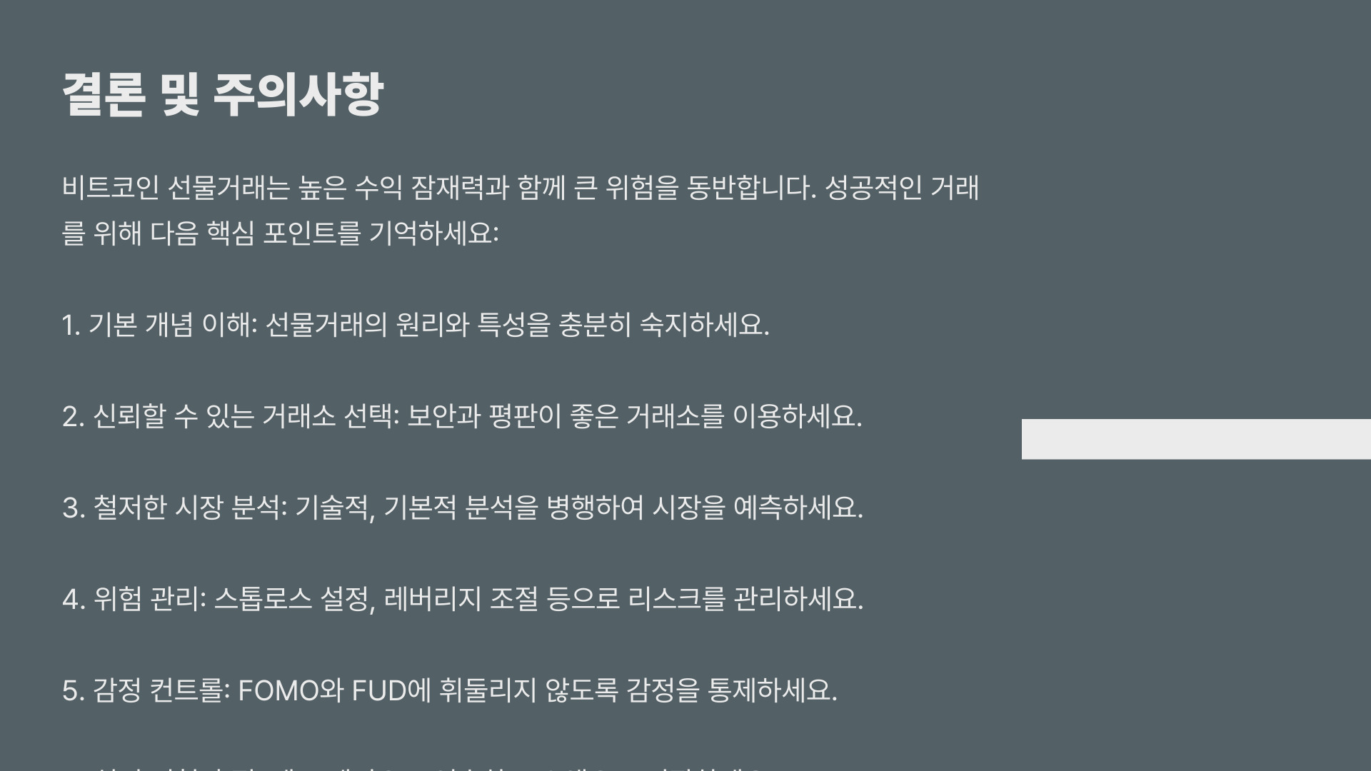비트코인 선물거래는 매력적인 투자 기회이지만, 그만큼 위험도 큽니다. 따라서 기본 원리와 거래소 선택, 시장 분석, 위험 관리 등을 충분히 이해하고 적용해야 성공적인 거래를 할 수 있습니다. 이러한 꿀팁들을 참고하여 보다 안전하고 효율적인 비트코인 선물거래를 경험해 보세요.