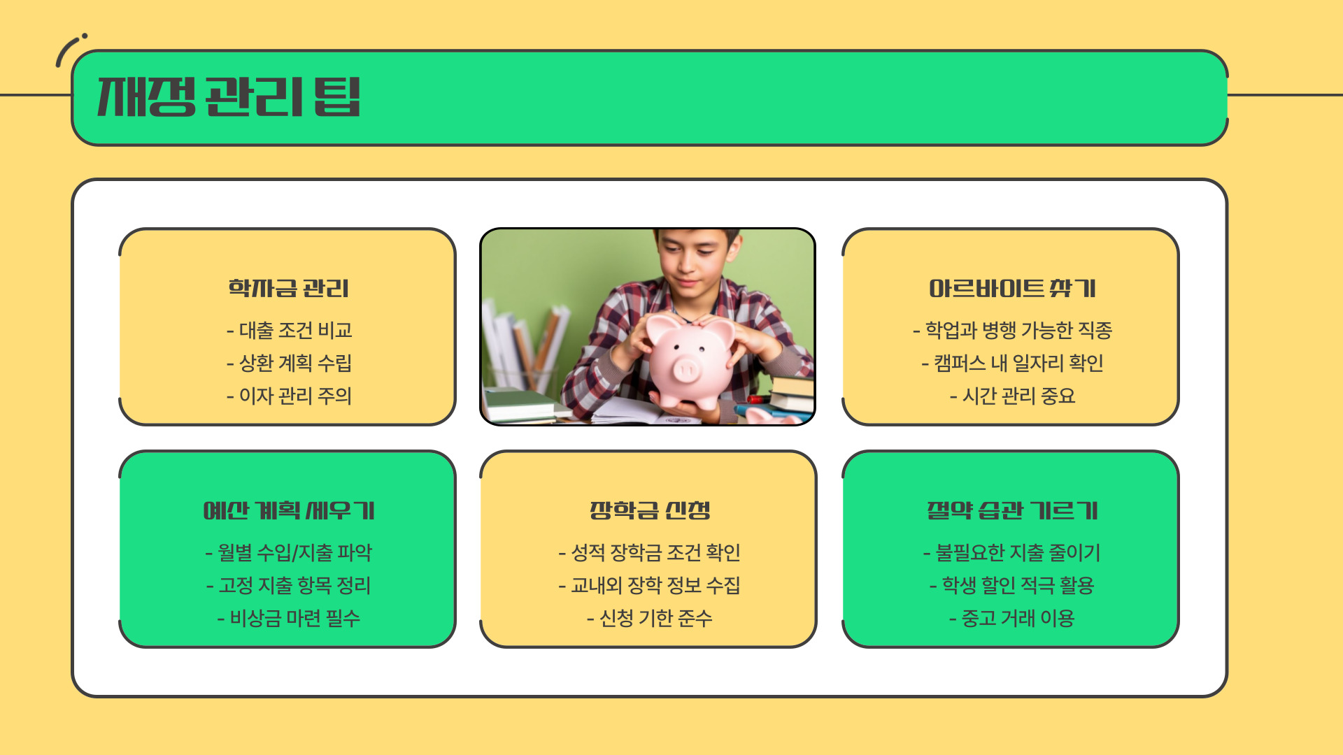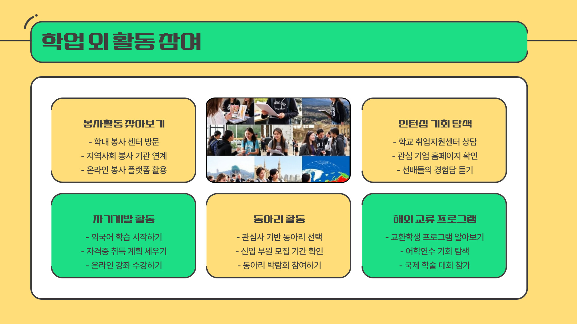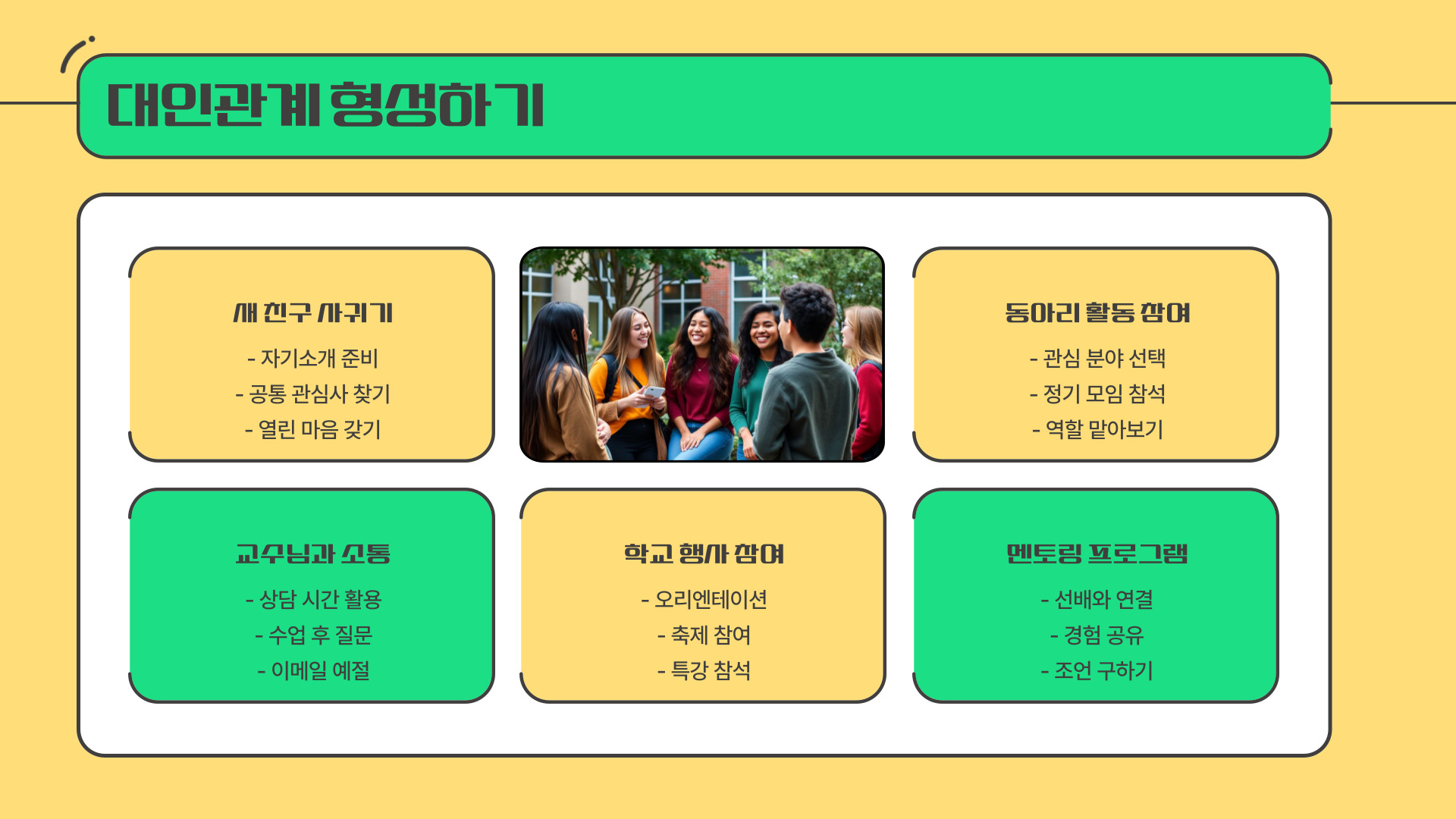 | 소통 | 친구 및 선배와의 적극적인 소통 |