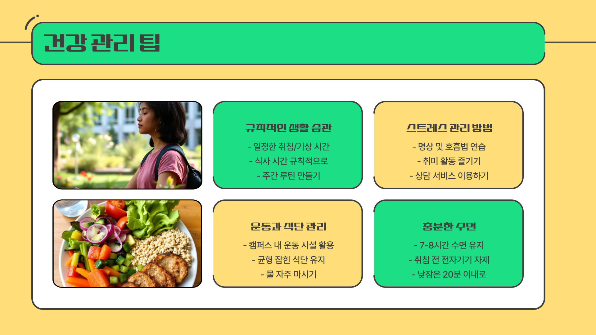 새학기를 맞이하여 건강한 생활 습관을 유지하는 것은 학업의 질을 높이는 데 중요한 요소입니다. 규칙적인 운동과 균형 잡힌 식사는 집중력과 에너지를 증진시킵니다. 매일 일정 시간 동안 운동을 하거나, 간단한 스트레칭을 포함한 루틴을 만드는 것이 좋습니다.