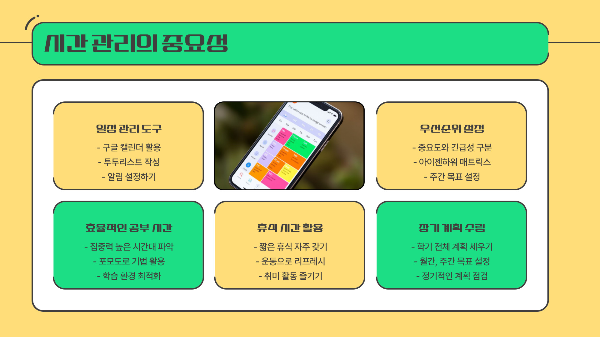 | 시간 관리 | 효율적인 일정 관리와 목표 설정 |