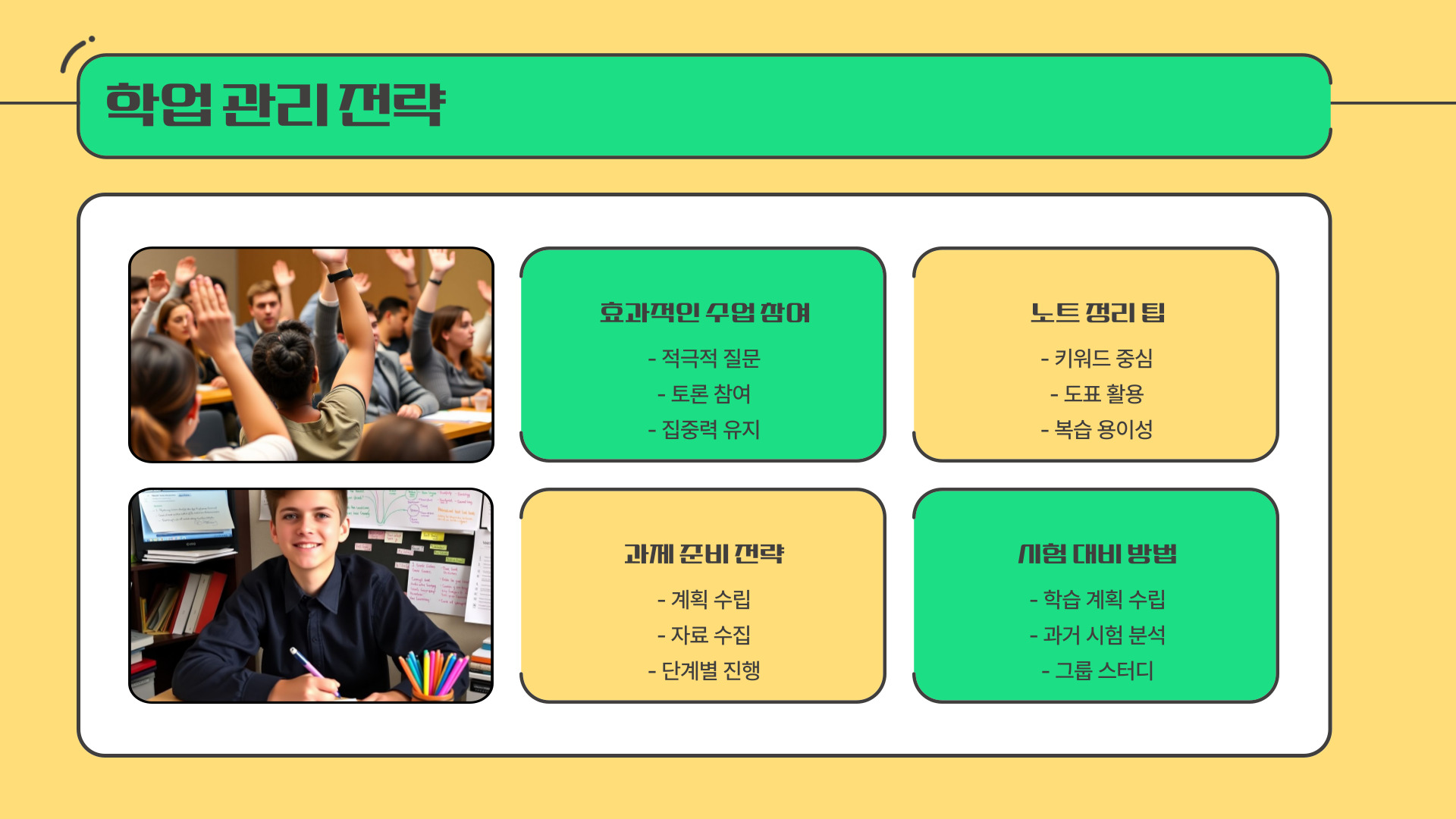 새학기를 맞이하면서 시간 관리 능력을 키우는 것은 매우 중요합니다. 효율적인 시간 관리는 학업 성취도를 높이는 데 큰 도움이 됩니다. 매일 할 일을 정리하고 우선순위를 매기는 것이 필요합니다. 예를 들어, 중요한 과제나 시험 준비를 미리 계획하여 시간을 분배하는 것이 좋습니다.