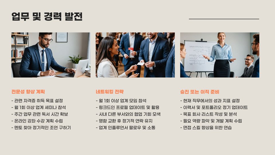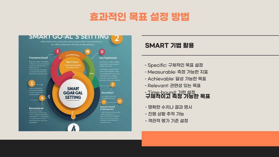 셋째, 목표 설정 시 SMART 원칙을 적용하는 것이 유익합니다. SMART는 Specific(구체적), Measurable(측정 가능), Achievable(달성 가능), Relevant(관련성), Time-bound(시간 한정)의 약자로, 이 원칙을 바탕으로 목표를 세우면 더 체계적이고 현실성 있는 계획을 세울 수 있습니다.
