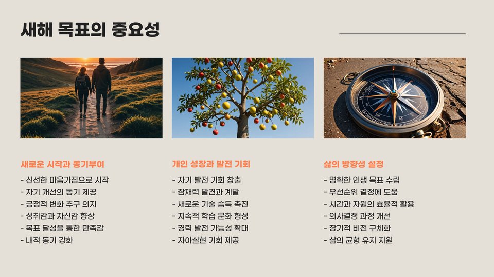 새해 목표는 개인의 성장과 발전을 위한 중요한 과정입니다. 이를 통해 자신을 더욱 발전시키고, 삶의 질을 높일 수 있습니다. 목표를 이루기 위한 여정에서 자주 동기부여를 받을 수 있는 방법을 찾아보세요. 친구와 함께 목표를 공유하거나, 목표에 대한 성취감을 느낄 수 있는 방법들을 고민해보는 것도 좋습니다.