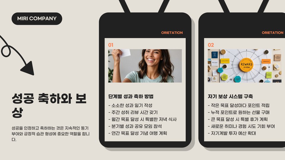 셋째, 목표 달성을 위한 동기 부여 방법을 생각해야 합니다. 달성한 목표마다 자신에게 보상을 주는 것도 큰 도움이 됩니다. 예를 들어, 매달 목표를 달성하면 자신에게 소소한 선물을 주겠다는 계획을 세우는 것입니다.