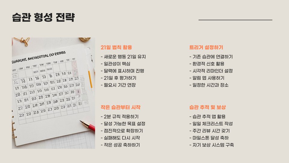 목표를 세운 후에는 실천 계획을 세워야 합니다. 목표를 이루기 위한 실행 가능한 단계를 설정하고, 이를 하나하나 지켜나가는 것이 중요합니다. 예를 들어, 건강한 식단을 목표로 한다면 매주 먹을 식단을 미리 계획하고, 장을 보는 날을 정하는 식의 방법이 필요합니다.