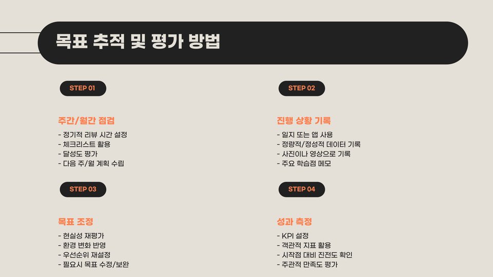 - 정기적인 점검을 통해 목표에 대한 진척도를 확인합시다.