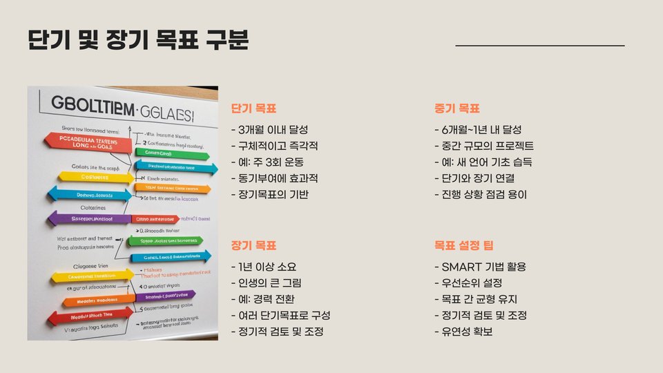 셋째, 목표 설정 시 SMART 원칙을 적용하는 것이 유익합니다. SMART는 Specific(구체적), Measurable(측정 가능), Achievable(달성 가능), Relevant(관련성), Time-bound(시간 한정)의 약자로, 이 원칙을 바탕으로 목표를 세우면 더 체계적이고 현실성 있는 계획을 세울 수 있습니다.