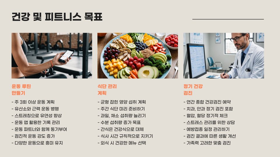 목표를 세운 후에는 실천 계획을 세워야 합니다. 목표를 이루기 위한 실행 가능한 단계를 설정하고, 이를 하나하나 지켜나가는 것이 중요합니다. 예를 들어, 건강한 식단을 목표로 한다면 매주 먹을 식단을 미리 계획하고, 장을 보는 날을 정하는 식의 방법이 필요합니다.