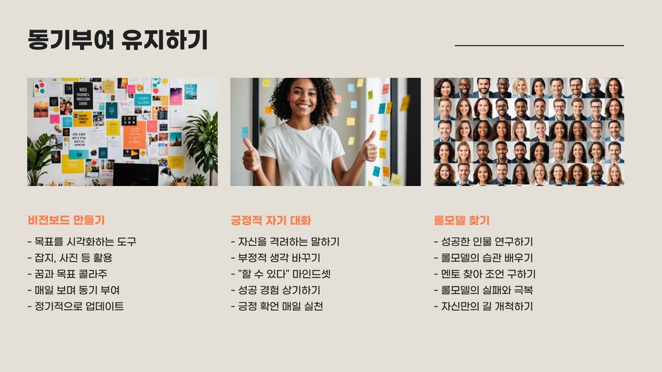 둘째, 주변인과의 소통을 통해 동기를 부여받는 것이 좋습니다. 친구나 가족과 목표를 공유하면 서로 격려하고 체크해줄 수 있는 시스템이 만들어져, 목표 달성에 도움이 됩니다.