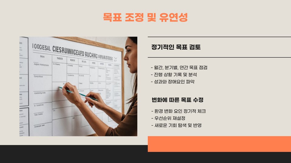 목표를 향해 나아가는 과정에서는 정기적인 자기 점검이 필수적입니다. 매달 목표 달성 여부를 점검하고, 필요한 경우 목표를 수정하거나 조정해야 합니다. 이렇게 하면 목표에 대한 의지를 유지하고, 실패에 대한 두려움을 줄일 수 있습니다.