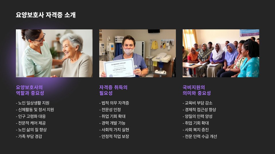- 요양보호사 자격증은 복지 인력으로서 중요한 역할을 한다.