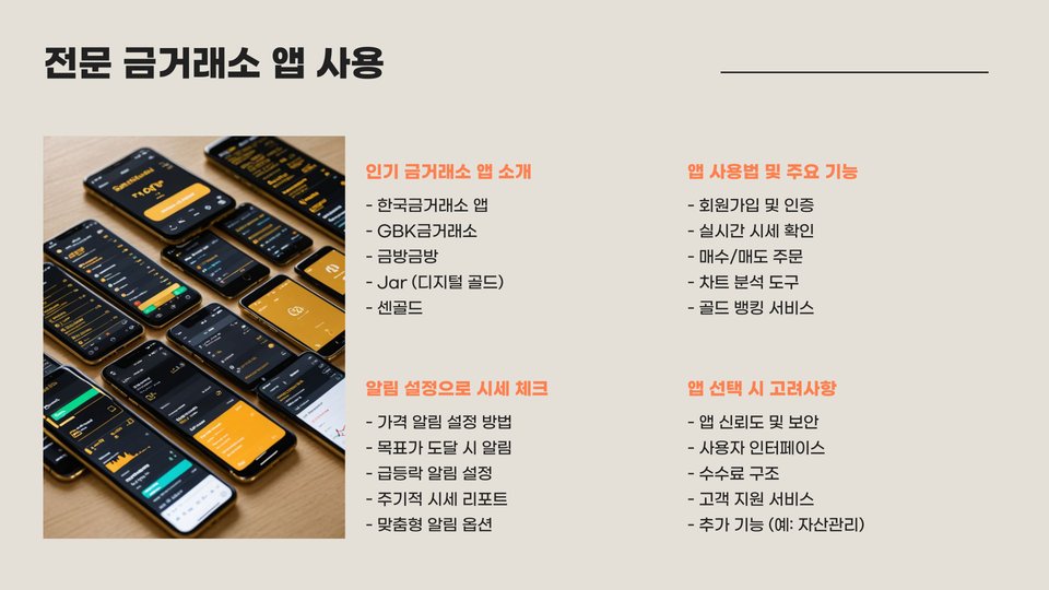 대표적인 앱으로는 금리가와 같은 앱이 있습니다. 이 앱은 사용자 맞춤형 금시세 알림 기능을 제공하고, 금 투자에 대한 기초 지식도 함께 학습할 수 있는 자료를 제공합니다. 실시간으로 업데이트되는 금 시세를 바탕으로 한 투자 결정을 도움을 주죠.