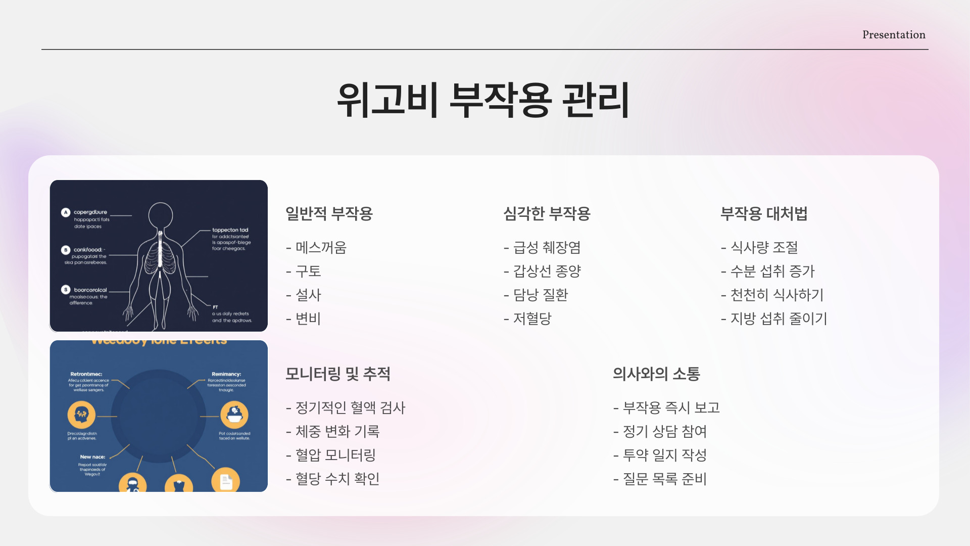 위고비 처방을 고려할 때는 주의해야 할 점이 몇 가지 있습니다. 약물의 효과가 개인에 따라 달라질 수 있으며, 다음과 같은 부작용도 발생할 수 있습니다: