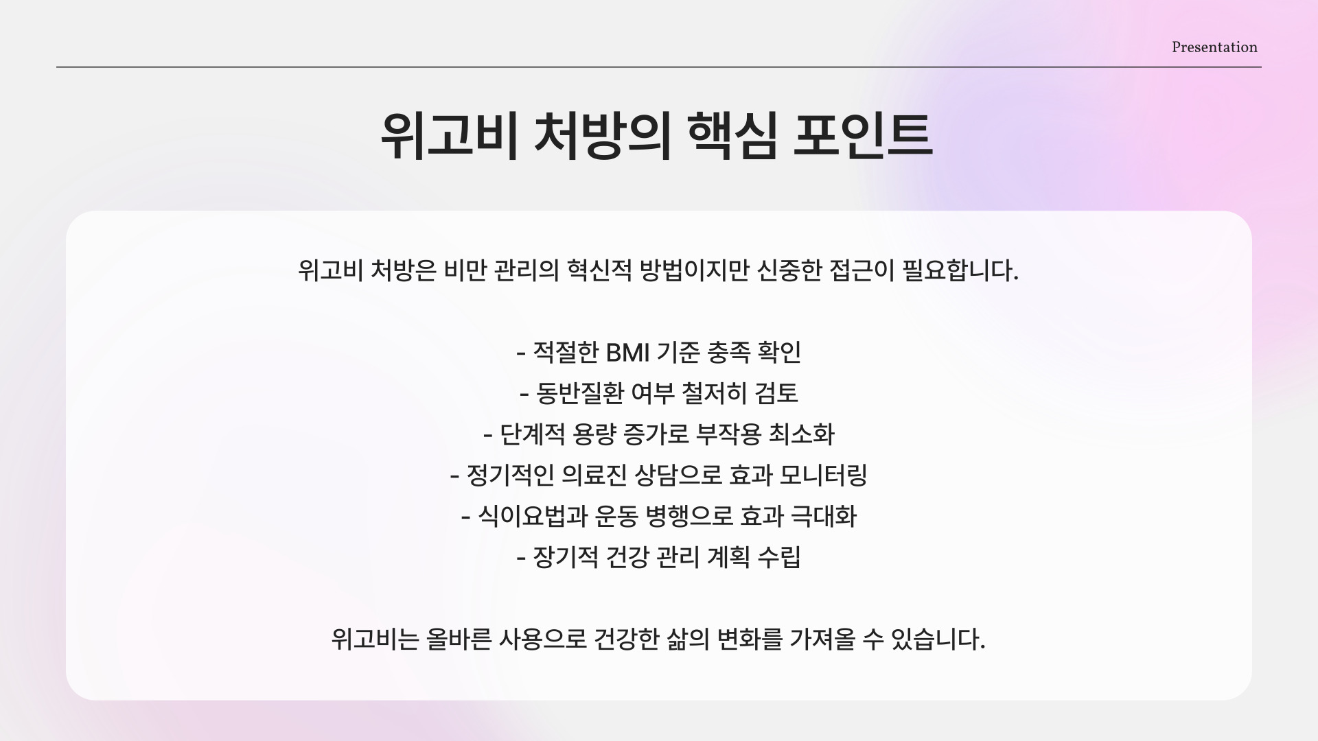 - 복용 루틴과 관리 일지를 통해 위고비 처방을 효과적으로 관리해야 한다.