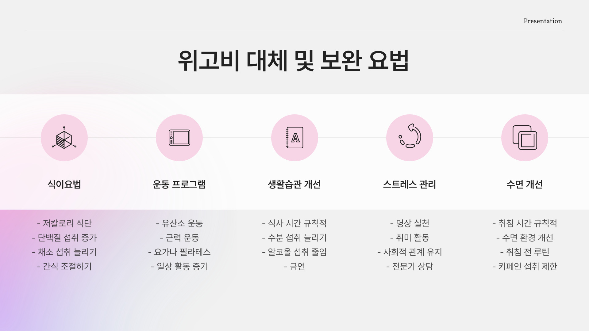 - 균형 잡힌 식사와 규칙적인 운동이 중요합니다.