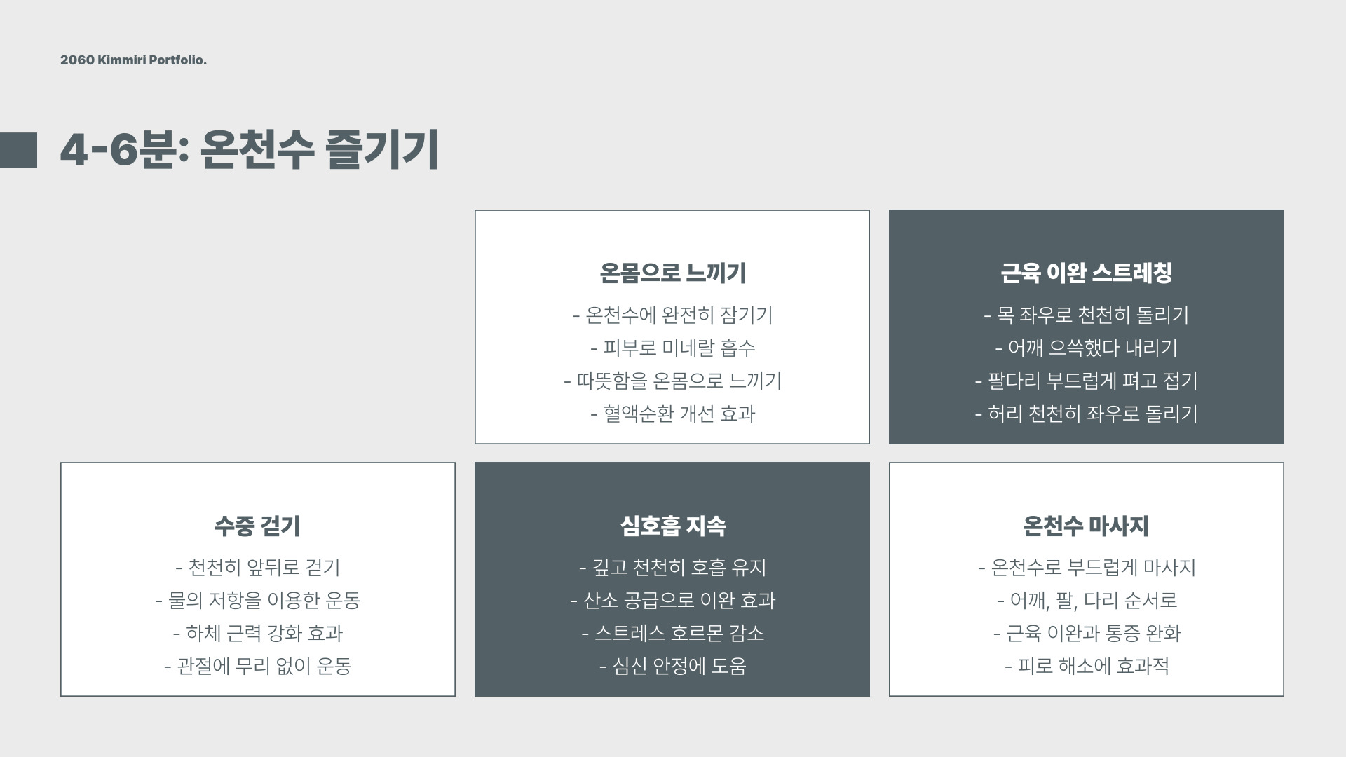 마지막으로, 편안한 신발도 잊지 마세요. 탕으로 이동하거나 가까운 곳에 머무를 때 가벼운 슬리퍼나 편한 신발을 착용하면 더욱 좋은 경험이 될 것입니다. 이 모든 준비물을 갖추고 10분간의 힐링을 준비하세요.