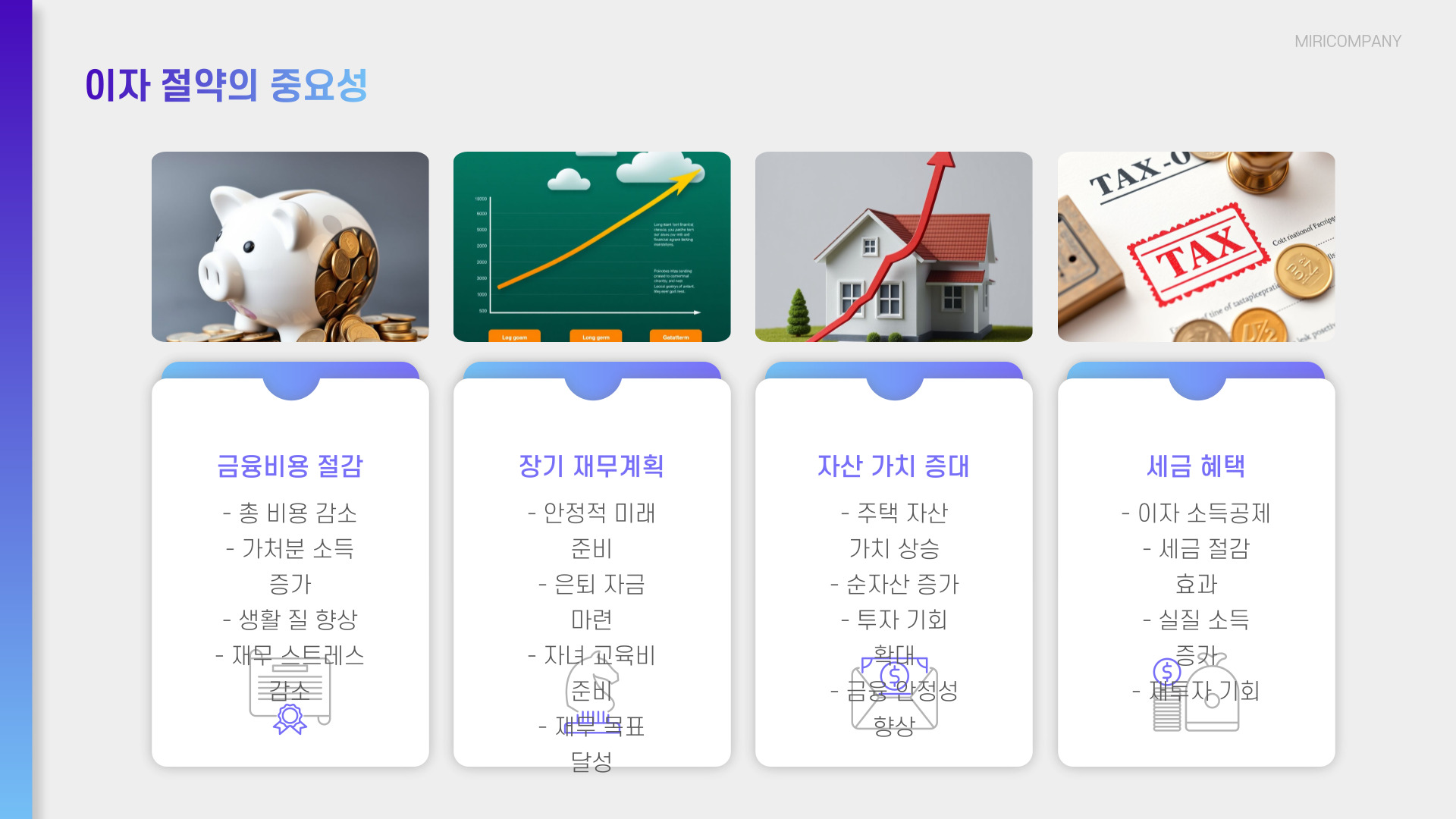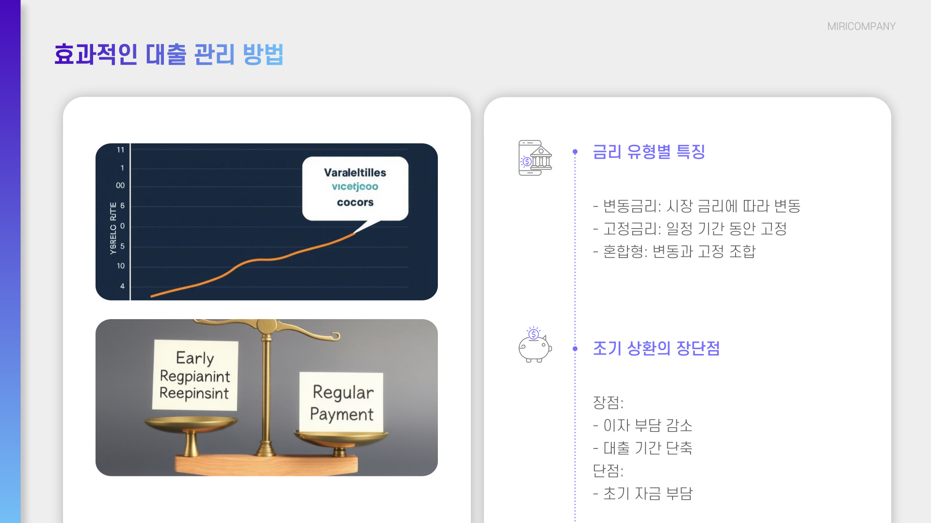 또한, 상환 기간을 단축시키는 것도 좋은 방법입니다. 대출을 조기에 상환하면 남은 이자도 줄어들어 전체 상환 금액을 절감할 수 있습니다. 이를 위해 원리금 균등 상환 방식 대신 원금 균등 상환 방식을 선택하는 것도 고려해보세요. 원금 균등 상환 방식은 초기 월 납입금이 높지만, 시간이 지날수록 이자 부담이 줄어드는 구조입니다.