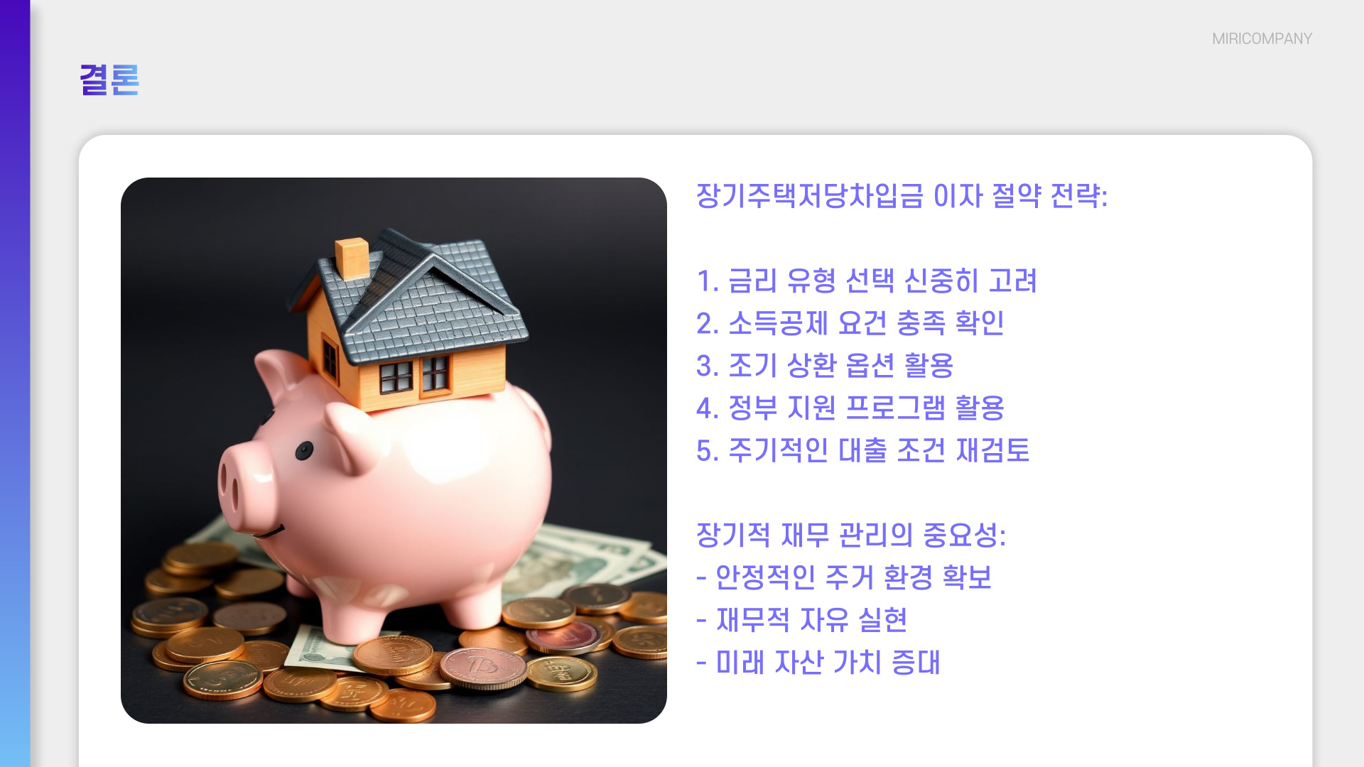 장기주택저당차입금 이자를 절약하는 방법은 여러 가지가 있습니다. 이자율을 잘 이해하고, 체계적인 상환 계획을 세우며, 필요시 재융자를 고려하고, 신용 점수를 관리하는 것이 중요합니다. 이러한 방법들을 통해 장기적으로 많은 금액을 절감할 수 있습니다. 이자 부담을 줄이기 위한 실천이 필요합니다.