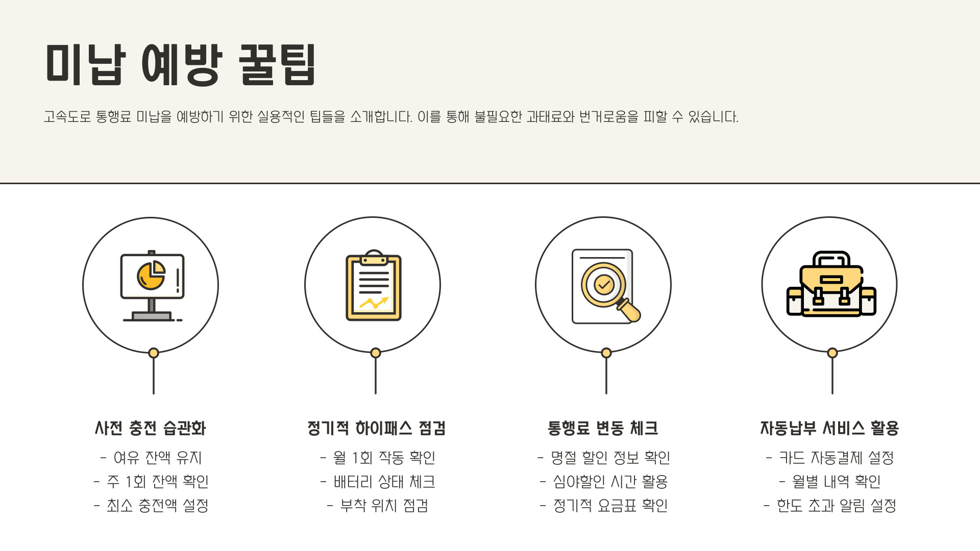 미납을 예방하기 위해서는 몇 가지 팁을 따라야 합니다. 첫째, 정기적으로 통행료 내역을 확인하는 습관을 들이는 것이 중요합니다. 둘째, 자동 납부 시스템을 활용하여 통행료를 자동으로 납부하도록 설정할 수 있습니다. 이외에도 납부 알림 서비스를 이용하여 미납을 방지할 수 있는 방법이 있습니다. 이러한 사전 예방 조치를 통해 통행료 미납으로 인한 불편을 줄일 수 있습니다.