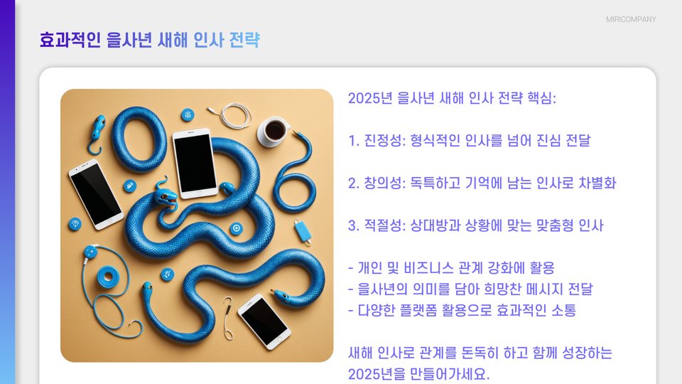 새해가 다가오면 우리는 사랑하는 사람들에게 새해 인사말을 전하는 기회를 갖습니다. 특히 2025년은 을사년에 해당하므로, 이 시기에 맞는 인사말이 무엇인지 알아보는 것이 중요합니다. 을사년은 간지 중 다섯 번째 해로, 기운과 에너지가 넘치는 시기로 간주됩니다. 그 특성을 반영한 인사말을 선택하는 것이 새해의 포문을 여는 데 큰 도움이 될 것입니다.