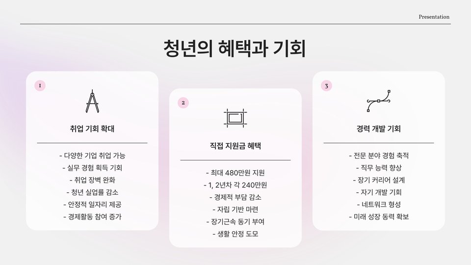이 프로그램의 가장 큰 장점은 청년들이 경제적으로 독립할 수 있도록 돕는 것입니다. 고용주에게는 인센티브를 제공하여 청년을 고용하는 데 따른 부담을 줄여줍니다. 이로 인해 청년들은 보다 다양한 직종에 도전할 수 있는 기회를 얻게 되며, 기업은 필요한 인력을 확보할 수 있습니다. 장기적으로는 청년 실업률 감소와 직업 안정성 향상에 기여합니다.