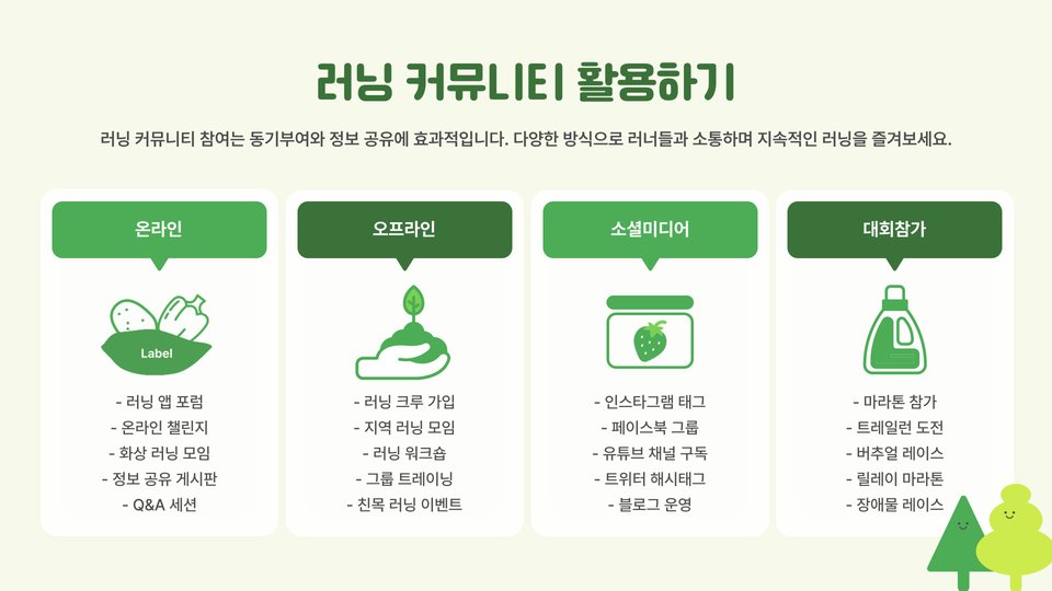 둘째, 러닝 계획을 세우는 것입니다. 일정을 정해 자신에게 맞는 시간을 찾아 정기적으로 달려야 합니다. 예를 들어, 아침에 일어나자마자 혹은 업무 마무리 후에 달리는 것이 좋습니다. 일관성을 유지하는 것이 중요하며, 본인의 페이스에 맞춰 점진적으로 거리를 늘려가는 것이 좋습니다.