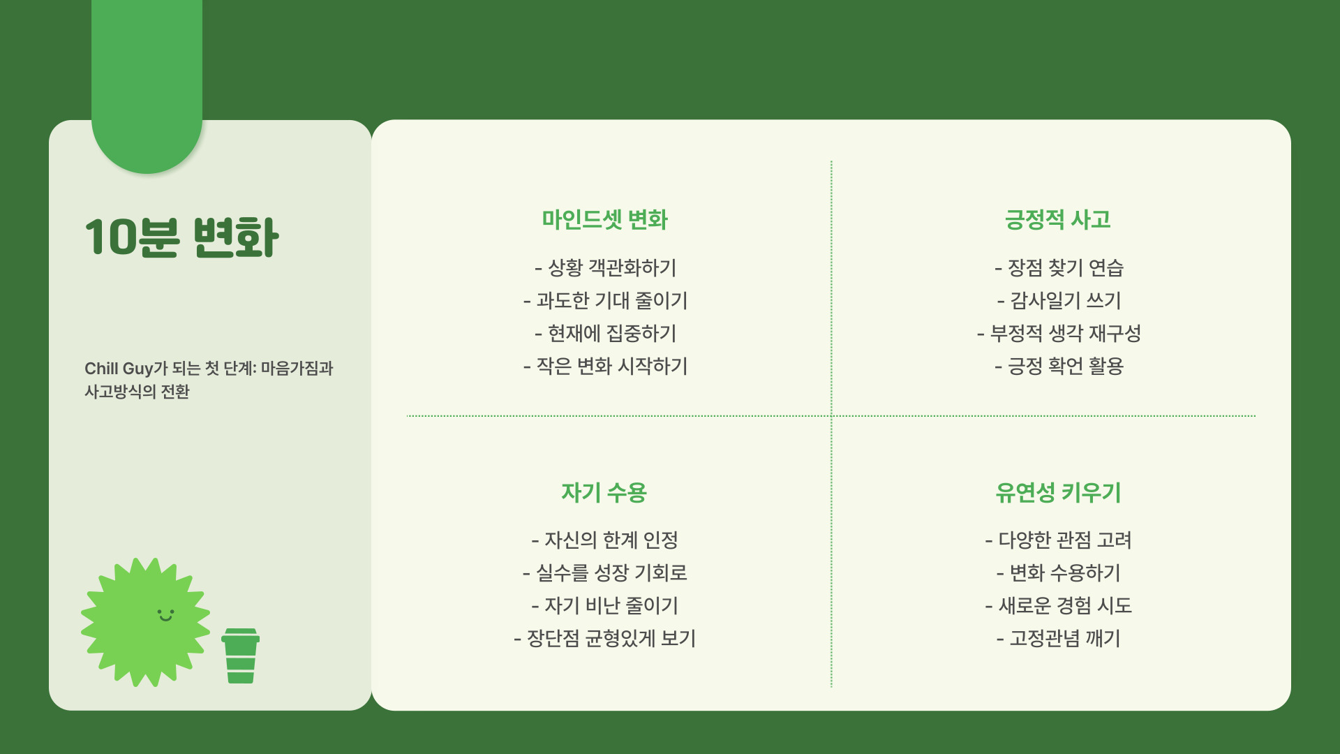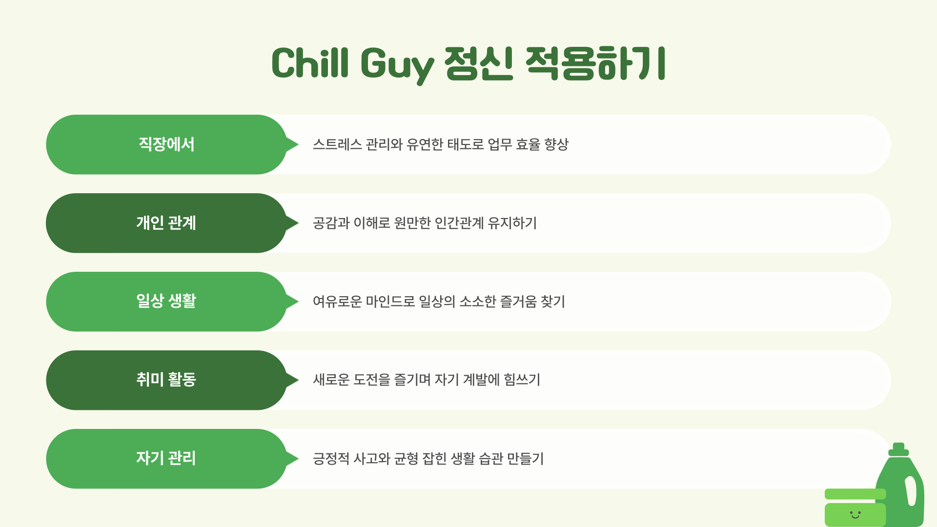 각 질문에 대해 솔직하게 답변해보세요. chill guy가 되려면 이러한 질문에 긍정적으로 대답할 수 있어야 합니다. 이렇게 간단한 질문을 통해 자신의 성향을 파악할 수 있습니다.