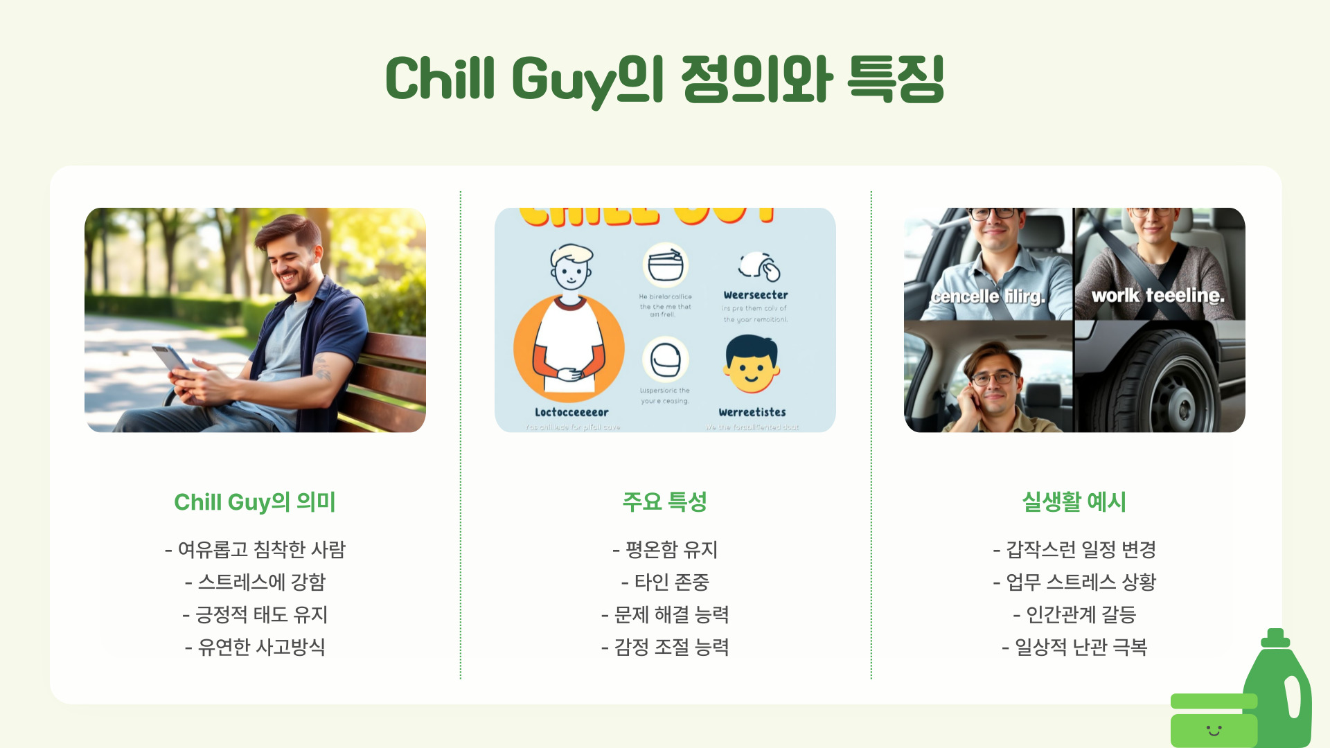 chill guy는 대체로 긍정적이고 스트레스를 잘 관리하는 사람입니다. 그들은 어려운 상황에서도 차분함을 유지하며, 다른 사람들과의 관계에서도 유연함을 보입니다. 여기 몇 가지 주요 특징을 살펴보겠습니다: