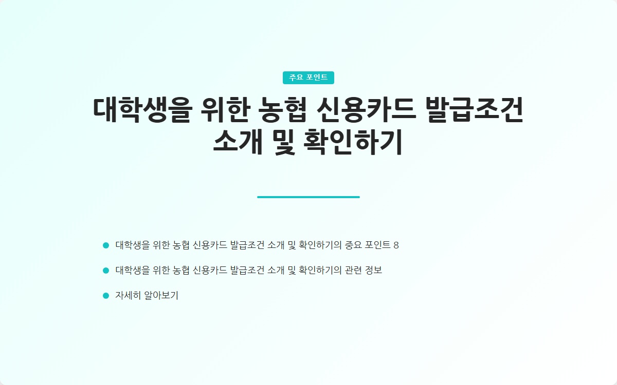 농협 신용카드는 대학생들에게 다양한 혜택을 제공하는 카드입니다. 발급 조건을 충족하고, 유의사항을 잘 숙지하여 현명하게 이용하면 많은 이점을 누릴 수 있습니다. 신용카드 발급을 고려하고 있는 대학생들은 위의 정보를 바탕으로 자신에게 맞는 카드를 선택해 보세요.