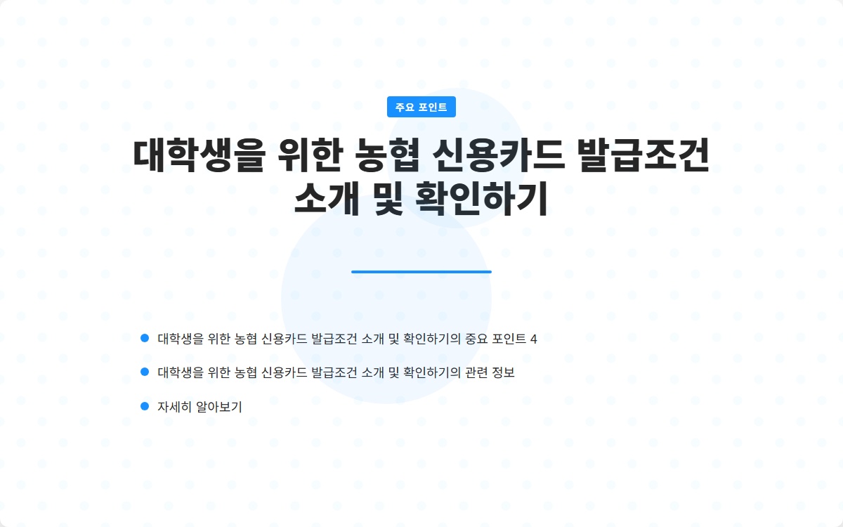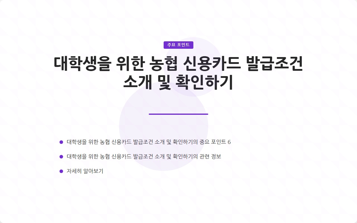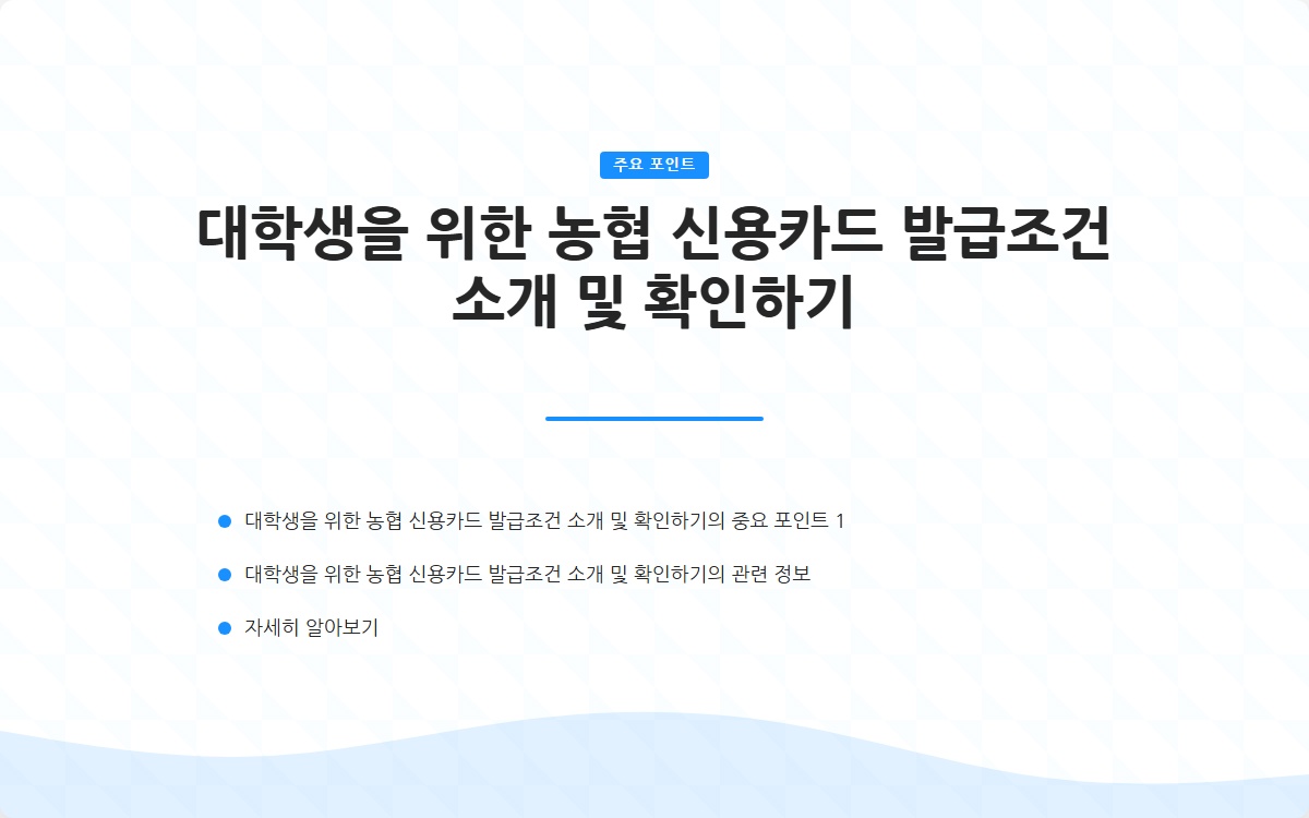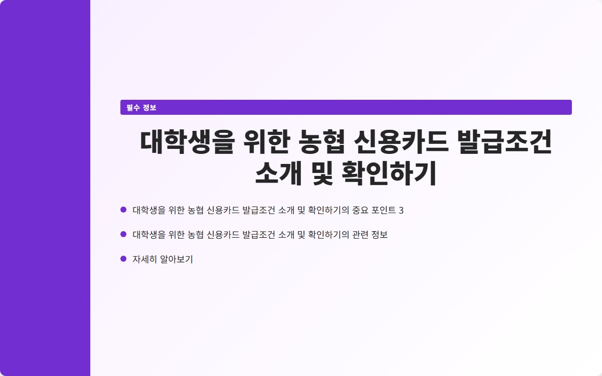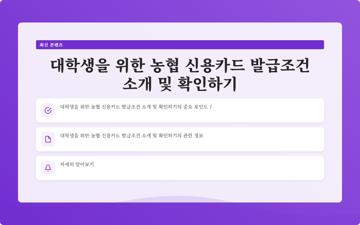 신용카드는 금융 거래에서 편리함을 제공하지만, 필요한 조건과 책임이 따릅니다. 농협 신용카드는 대학생을 위해 특별히 설계된 혜택이 있어 많은 이들이 선호하는 카드 중 하나입니다. 이 글에서는 농협 신용카드의 발급 조건을 자세히 소개하고, 발급을 위해 유의해야 할 점들을 설명하겠습니다.