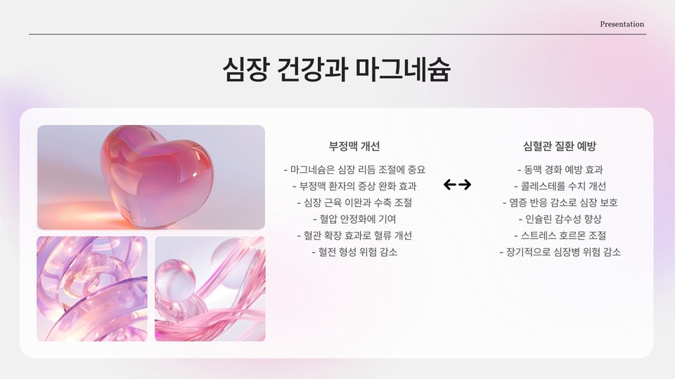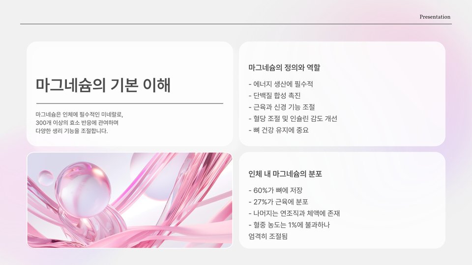 • 마그네슘은 근육, 신경, 에너지 생성 및 정신 건강에 중요한 역할을 한다.