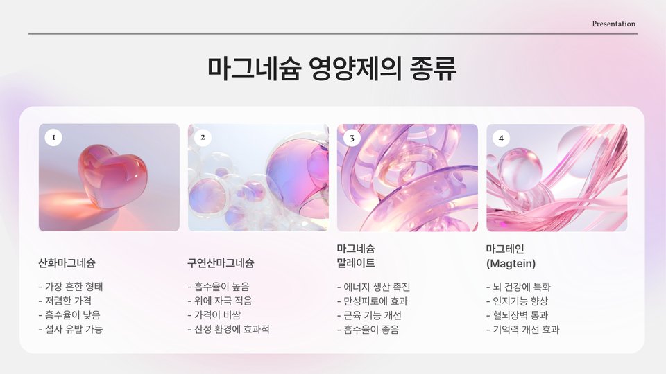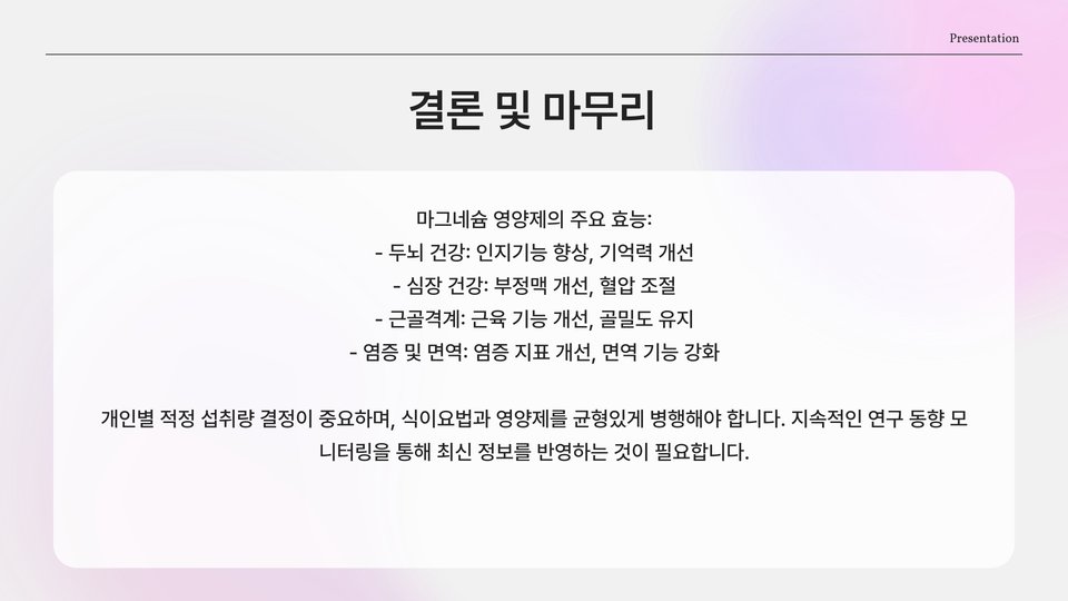 마그네슘 영양제는 건강을 유지하고 증진하는 데 중요한 역할을 합니다. 다양한 형태와 효능을 이해하고, 올바른 방법으로 섭취하는 것이 중요합니다. 마그네슘의 효능을 최대한 활용하기 위해서는 개인의 건강 상태에 맞는 섭취 방법과 주의사항을 숙지하는 것이 필요합니다. 건강한 삶을 위한 첫걸음은 적절한 영양 섭취에서 시작됩니다.