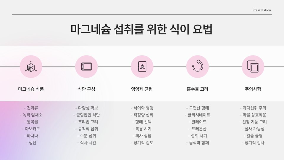 마그네슘 영양제는 현대인의 건강을 지키기 위한 중요한 보충재가 될 수 있습니다. 올바른 정보와 주의사항을 바탕으로 자신에게 맞는 섭취 방법을 찾고, 건강에 긍정적인 영향을 미치는 마그네슘을 효과적으로 활용해 보세요.