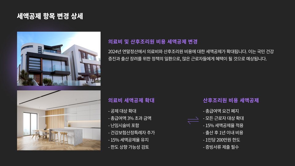 또한, 청년층과 경력 단절 여성을 위한 특별 공제 항목이 신설되어, 이들이 경제적으로 안정될 수 있는 기반을 마련해 주고 있습니다. 이러한 변화는 저출산 문제 해결에도 기여할 수 있는 긍정적인 요소로 작용할 것으로 기대됩니다.