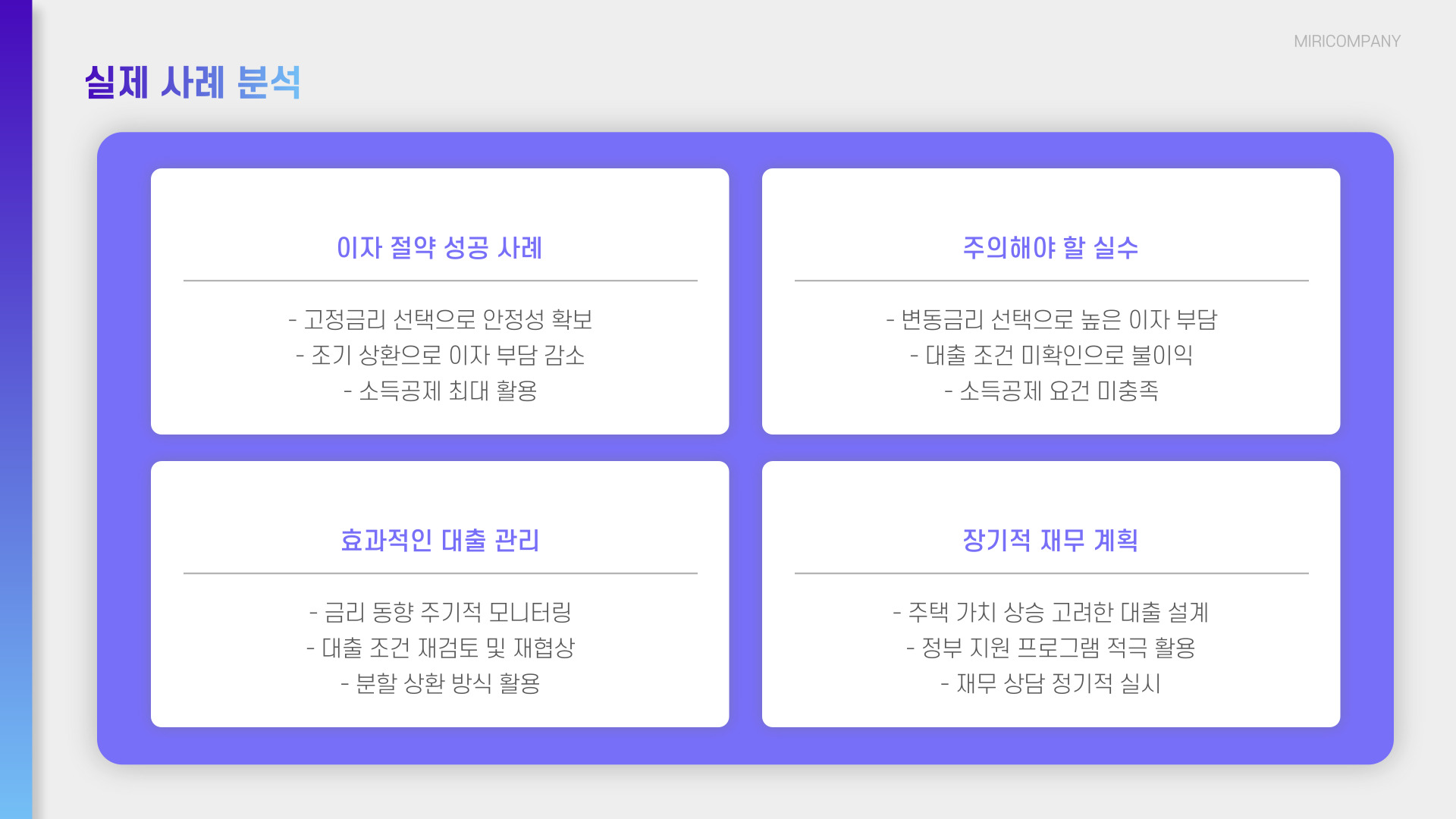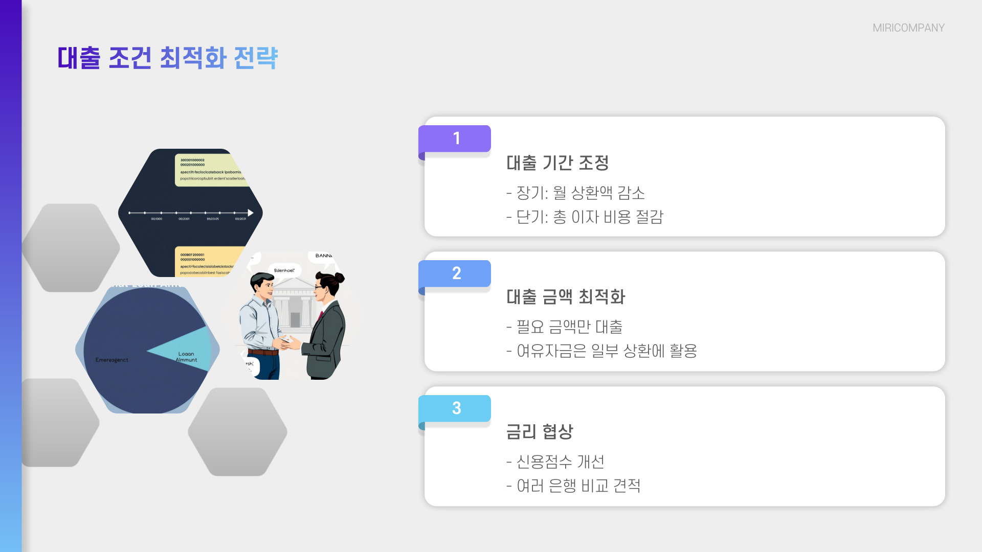 또한, 상환 기간을 단축시키는 것도 좋은 방법입니다. 대출을 조기에 상환하면 남은 이자도 줄어들어 전체 상환 금액을 절감할 수 있습니다. 이를 위해 원리금 균등 상환 방식 대신 원금 균등 상환 방식을 선택하는 것도 고려해보세요. 원금 균등 상환 방식은 초기 월 납입금이 높지만, 시간이 지날수록 이자 부담이 줄어드는 구조입니다.