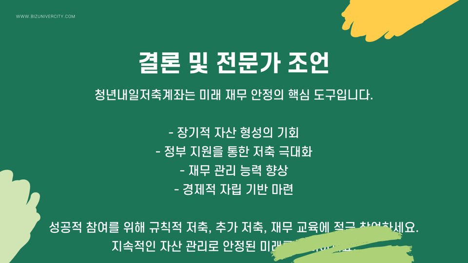 청년내일저축계좌는 청년들이 안정된 미래를 준비할 수 있는 소중한 기회입니다. 이 계좌를 통해 체계적인 저축과 정부의 지원을 통해 자산을 축적할 수 있습니다. 각 단계에서의 성공 비법을 잘 활용하면, 청년들은 더 나은 내일을 맞이할 수 있을 것입니다. 따라서, 지금 바로 청년내일저축계좌에 가입하고 재정 관리를 시작해보세요!